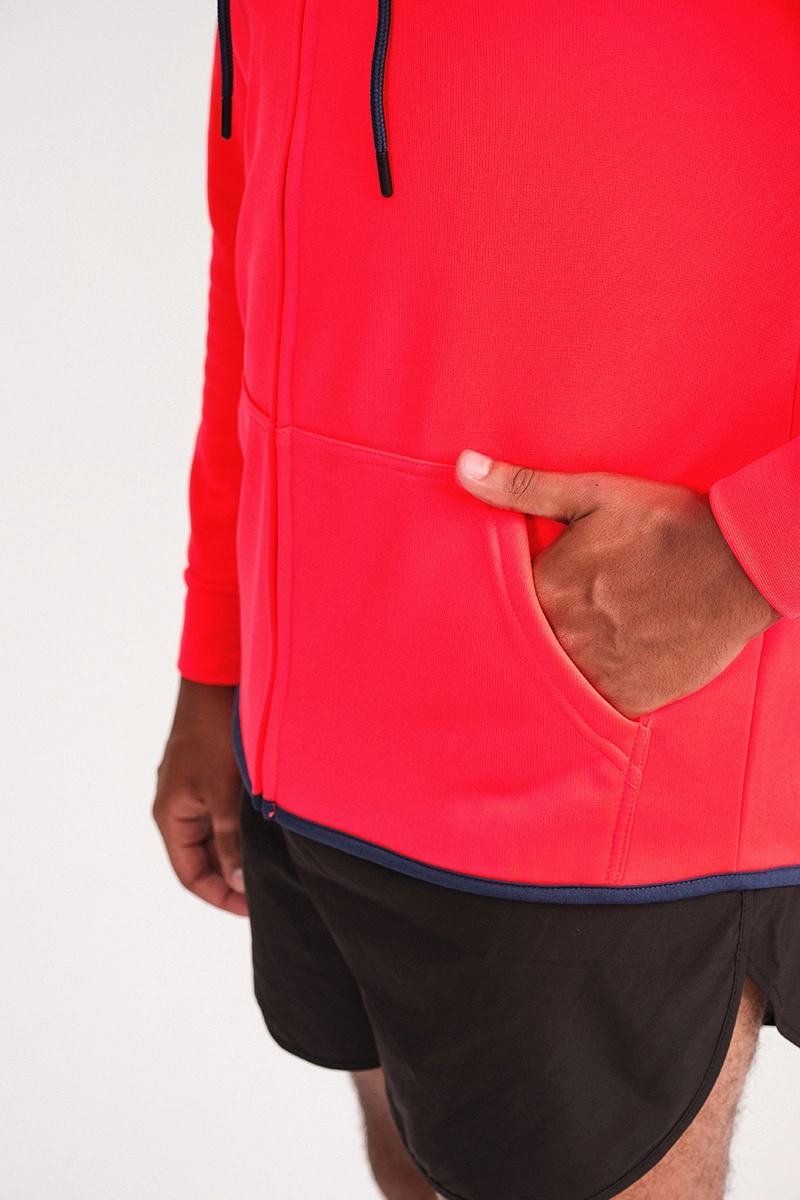 Cremallera completa, bolsillos laterales, ajuste de cuello, capucha con interior a contraste, confección ergonómica, eficiente evaporación del exceso de humedad para mantener seco tu cuerpo… ¡todo lo que necesitas!